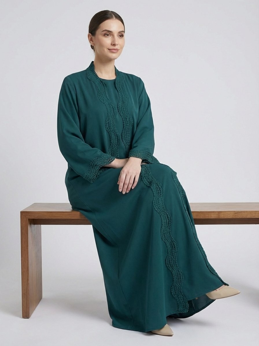 Be the first to review “Teal Wavy Crochet Trim Open Front Abaya”